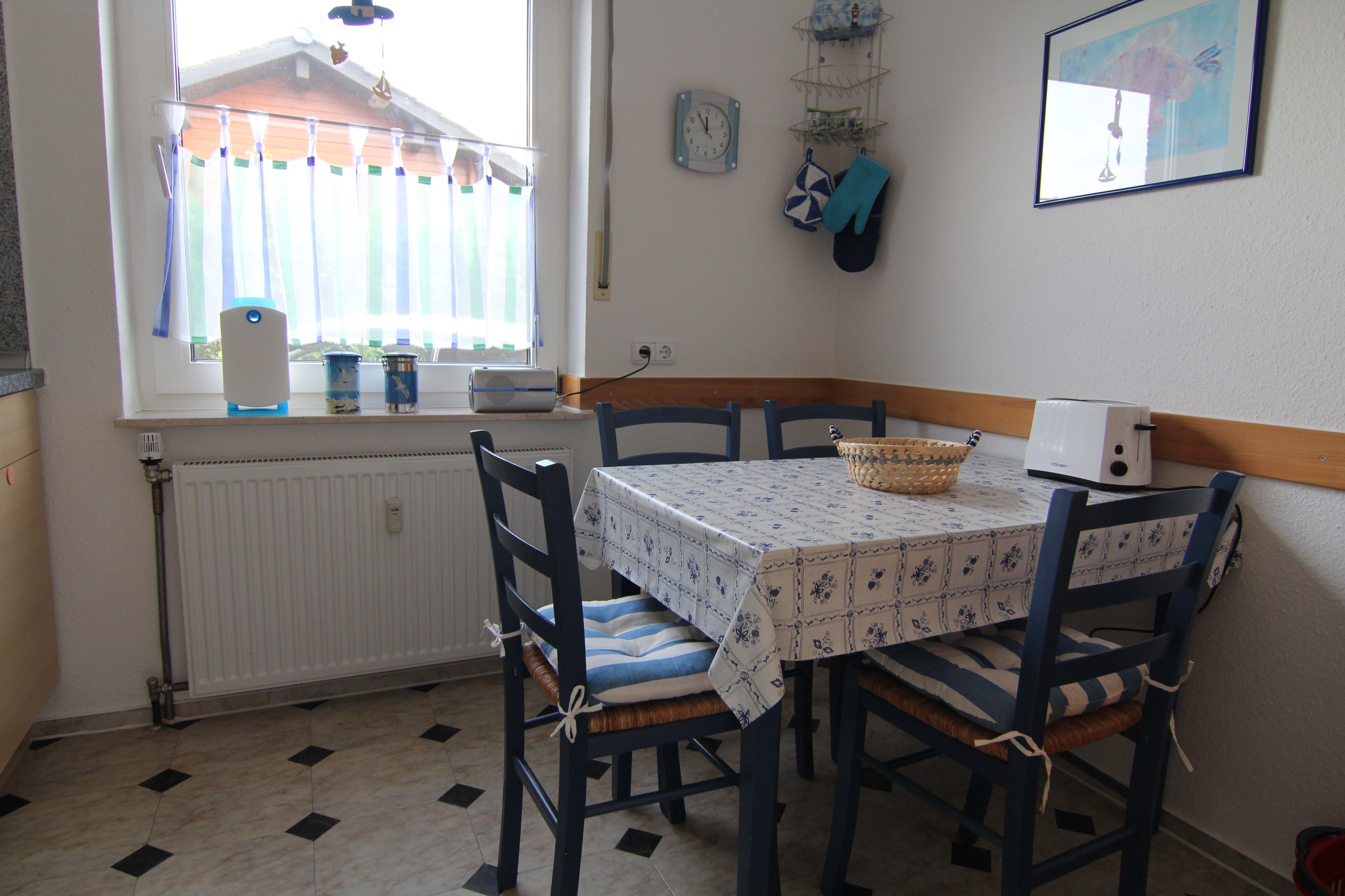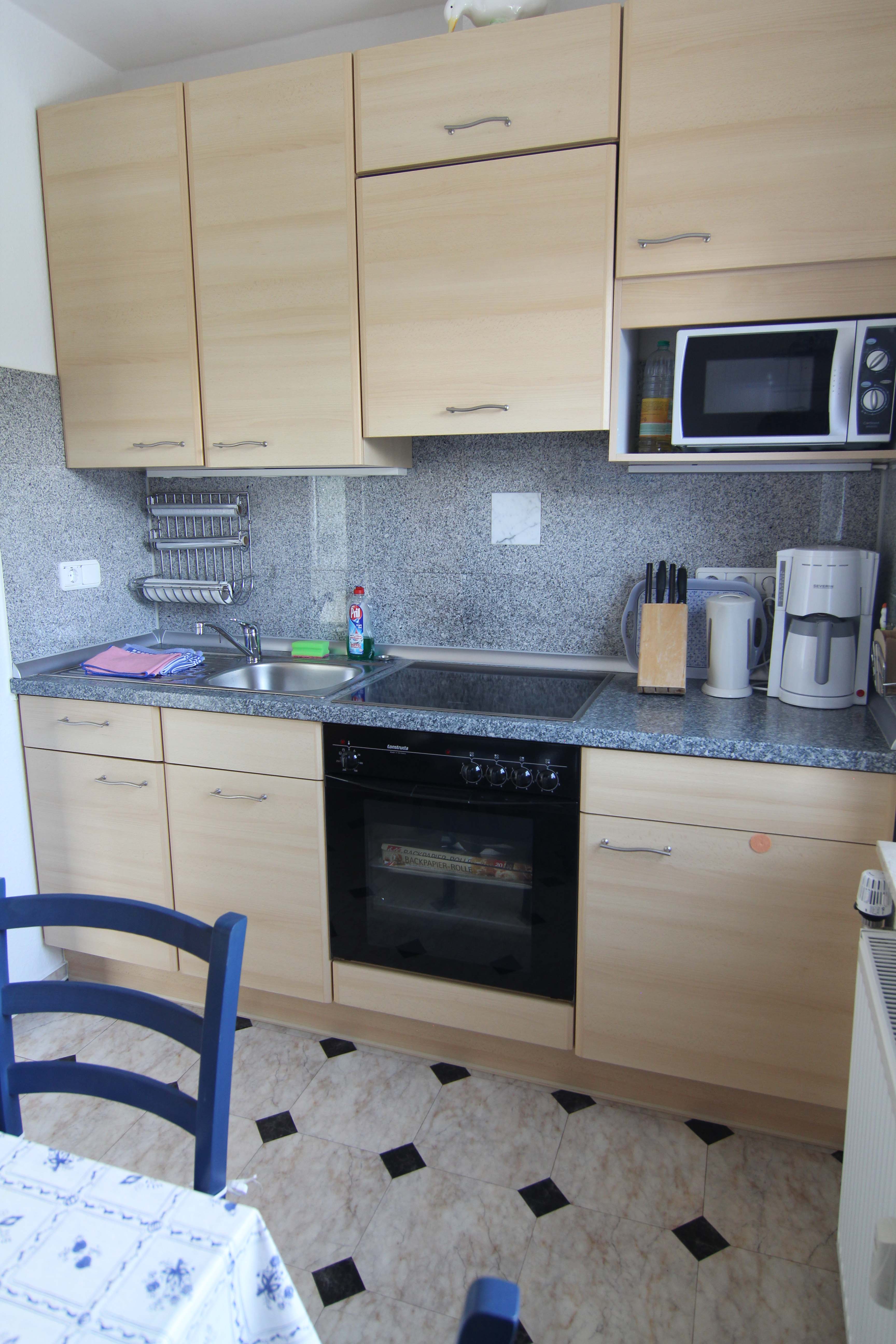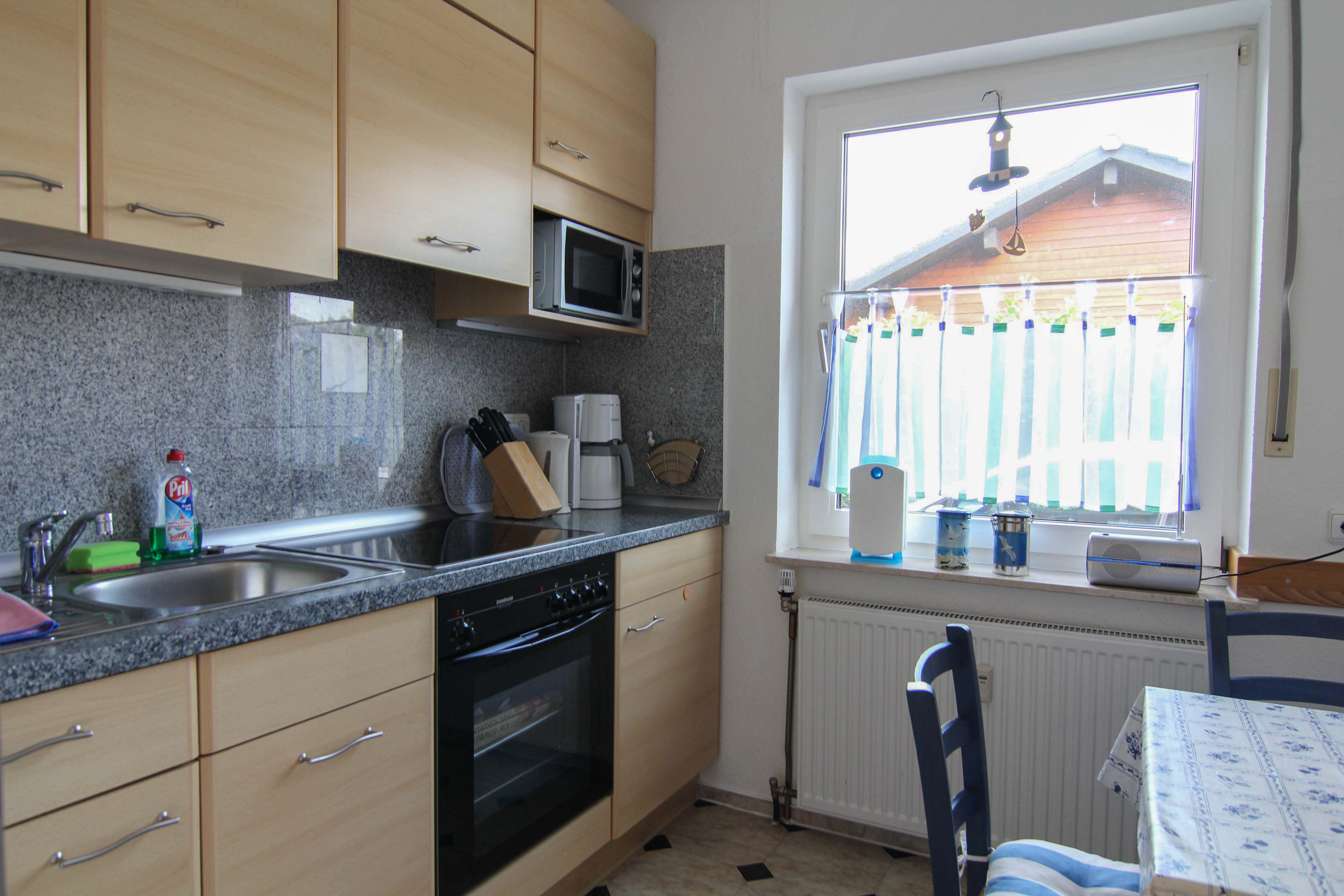 Zu der Ausstattung der Küchenzeilen gehören eine Mikrowelle, ein Cerankochfeld und ein Backofen. In der Küche findet der Feriengast eine gemütliche Eßecke.