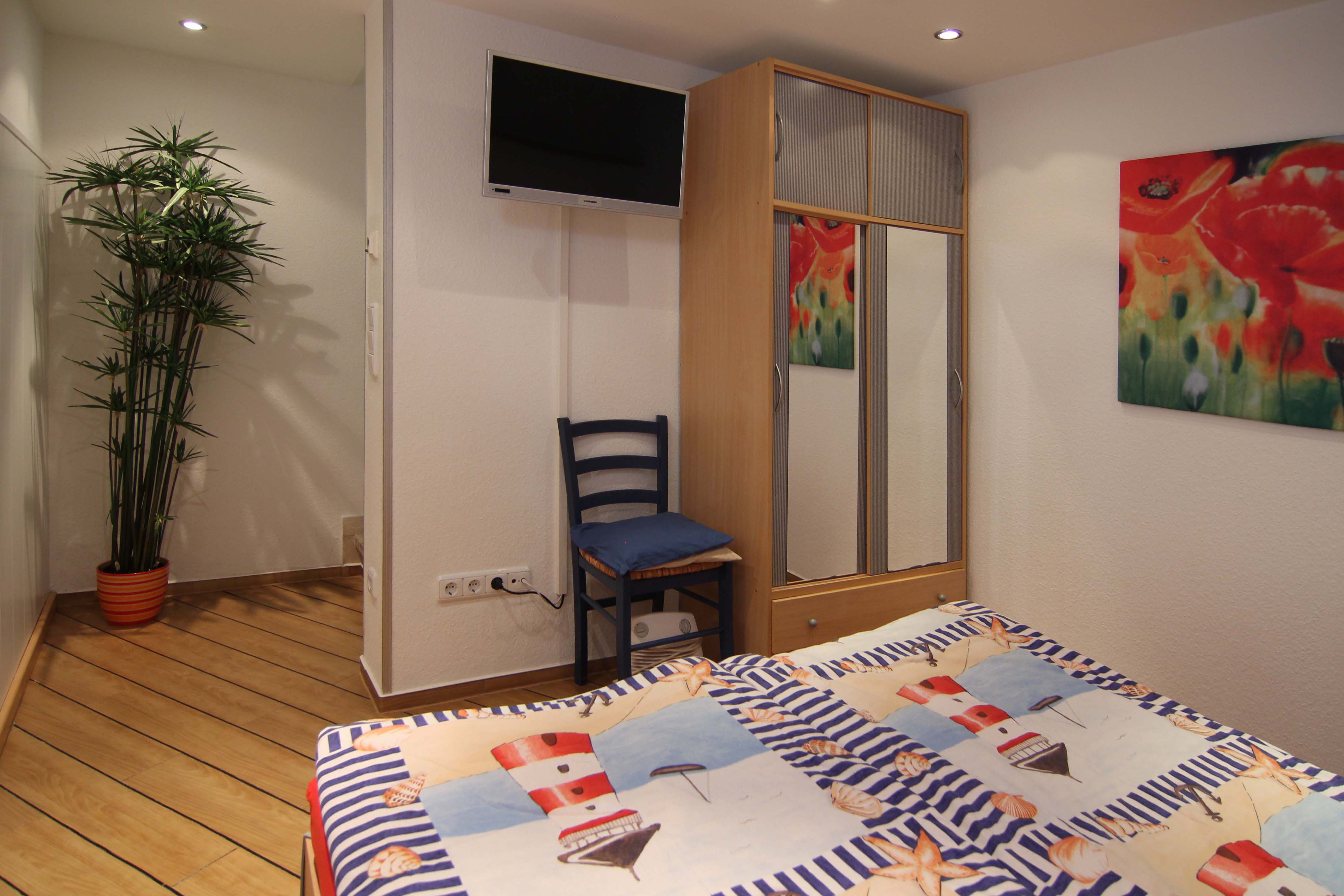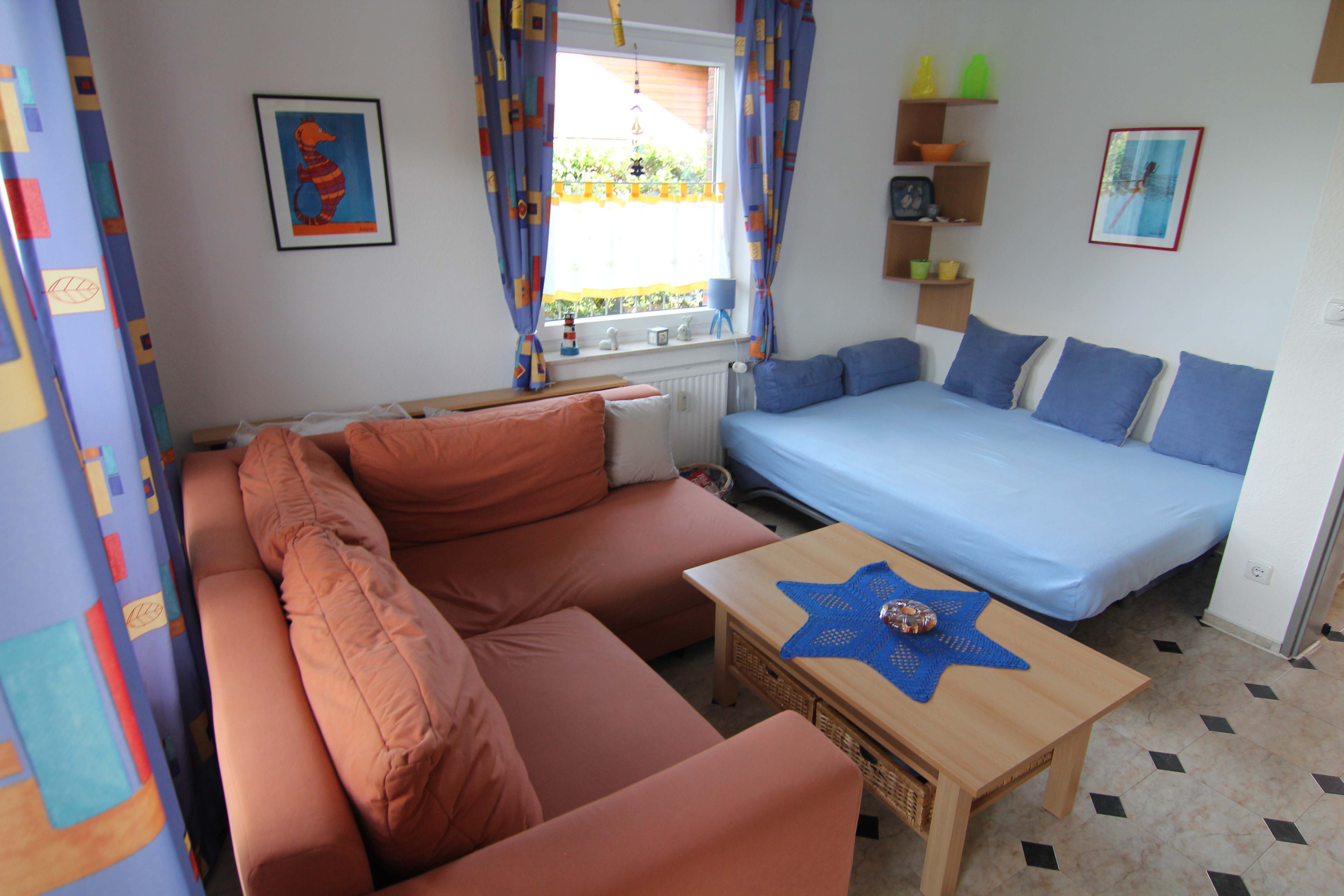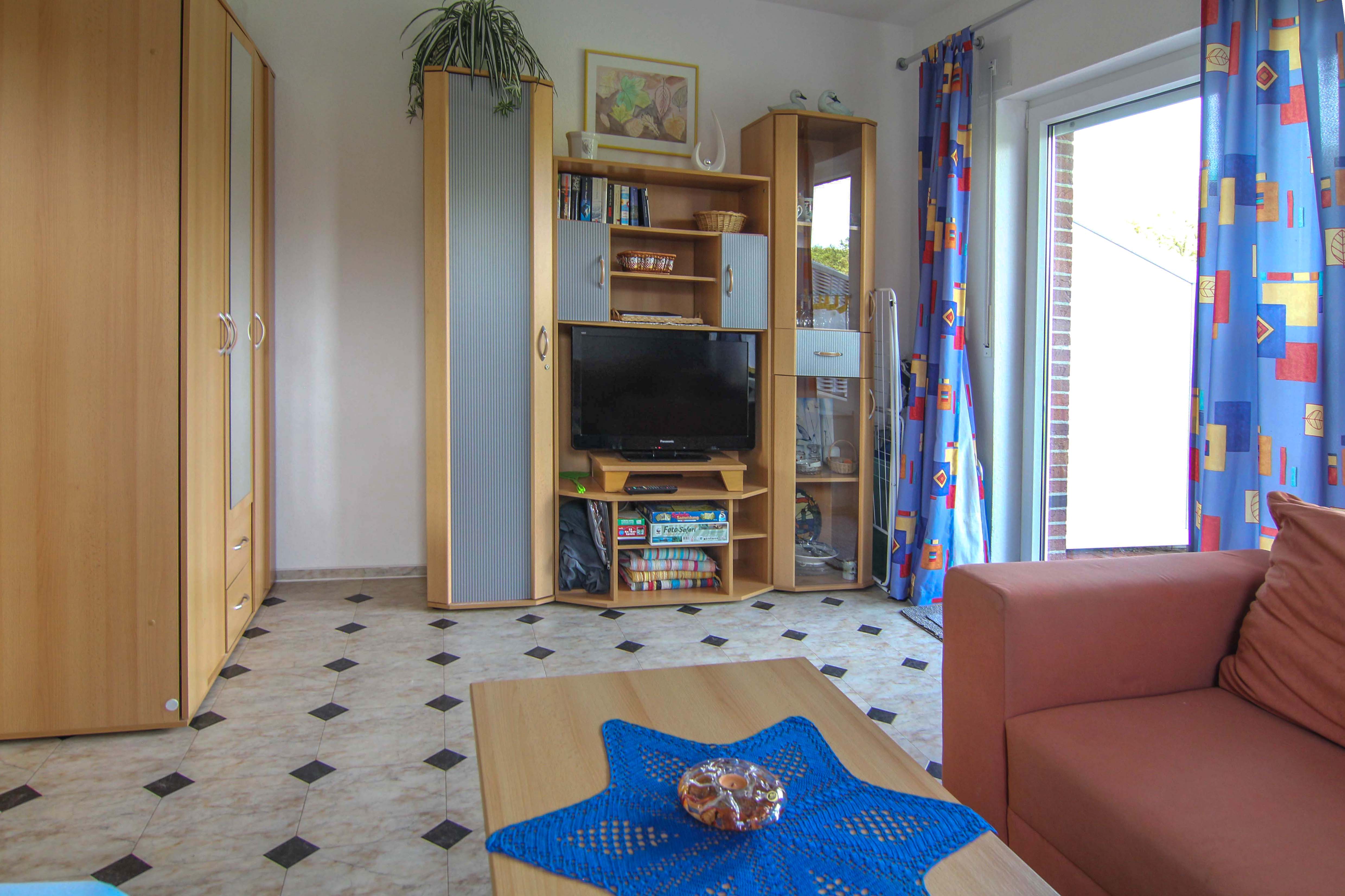 Das Wohnzimmer, welches den Zugang zu einem eigenen Garten und der Terrasse ermöglicht, ist durch seine großen Fenster freundlich und hell gestaltet. Neben einer gemütlichen Sitzcouch und einem Beistelltisch findet sich zudem eine Schlafcouch, welche sich zu einem alternativen Schlafplatz ausklappen lässt. Zusätzlich hierzu verfügt es über einen Fernseher und einen zusätzlichen Kleiderschrank.